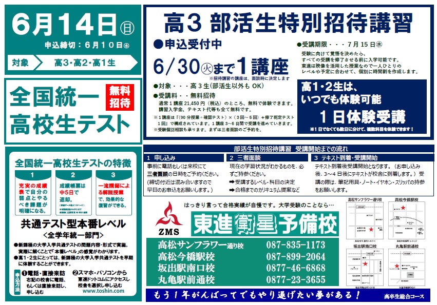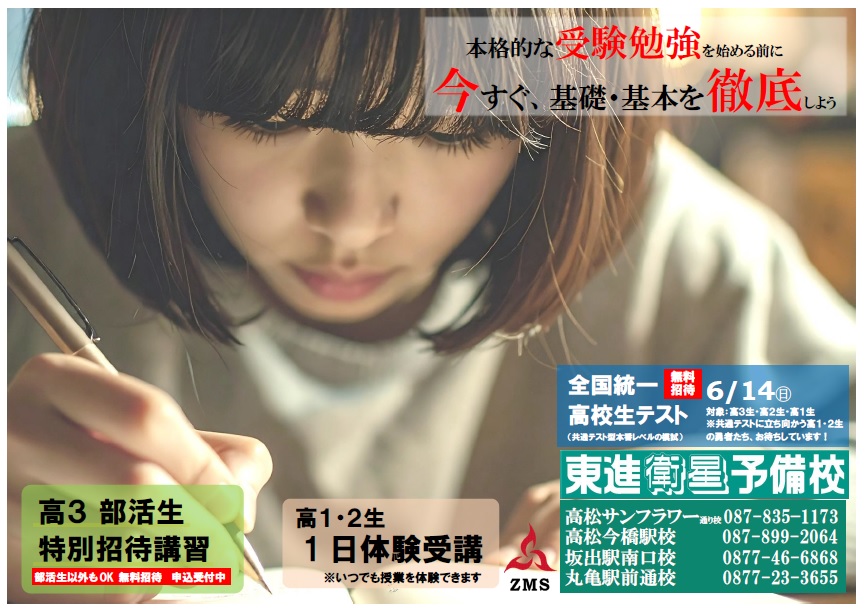 部活やっている高3生は、引退まで部活だけに集中してやりきりたいという気持ちもわかりますが、そこに並行して、部活引退までにやらないといけない学習を、一緒にやりませんか。待っています。
